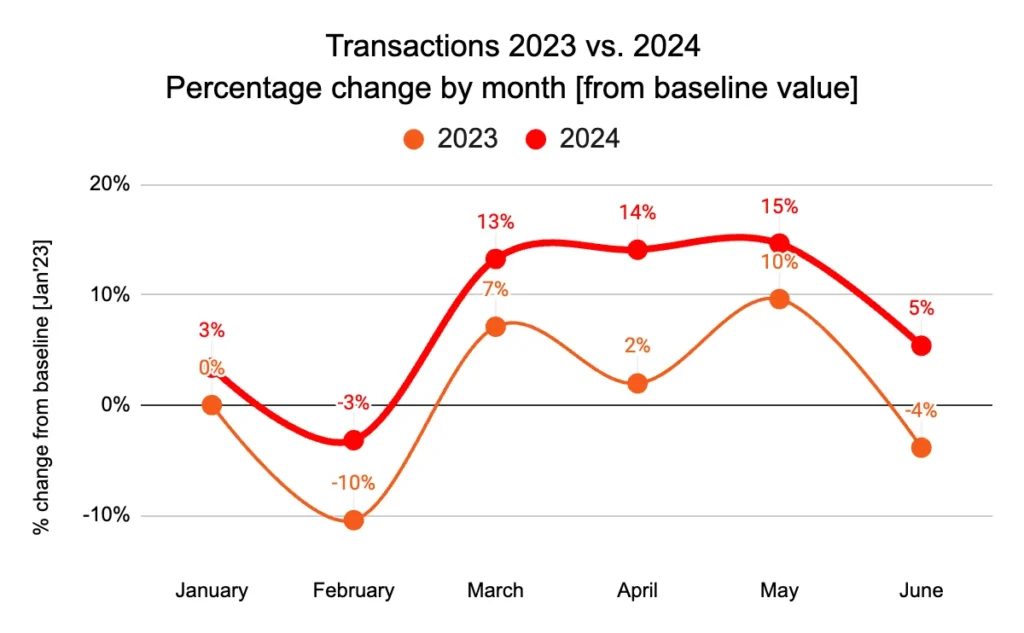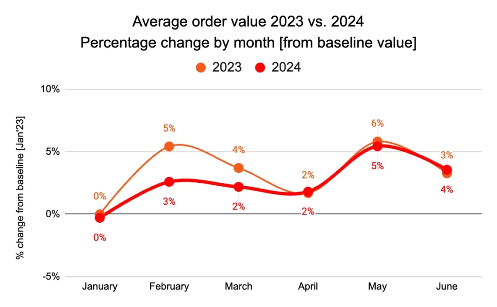 Consumer sentiment seems to be improving. Despite being slightly lower in 2024, AOV saw an upward trend during the first 6 months of the year. AOV was 4% higher in June compared to January 2024.