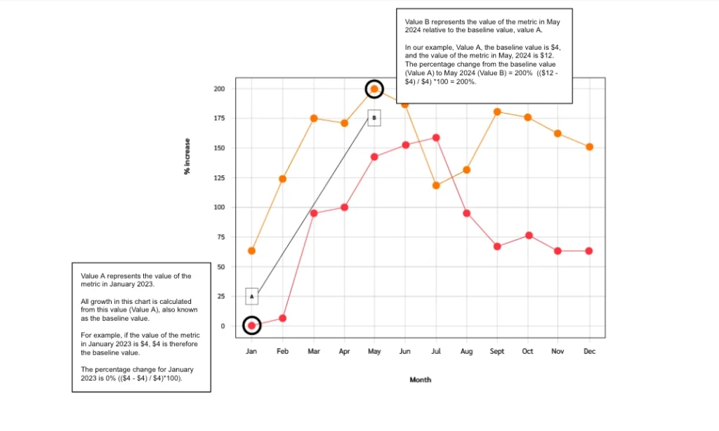 Our analysis measured all values as a percentage change relative to the baseline value from January 2023.