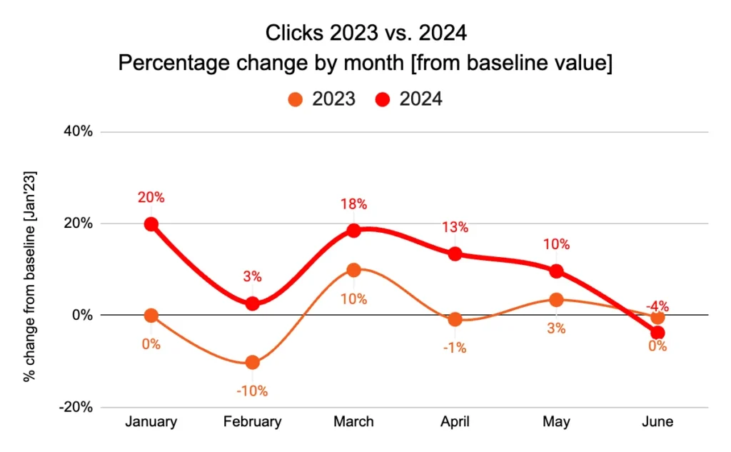 Consumers continued to spend cautiously, conducting more research online before purchasing. This shift is reflected in the 10% increase in clicks during the first six months of the year as consumers made more purchases online.