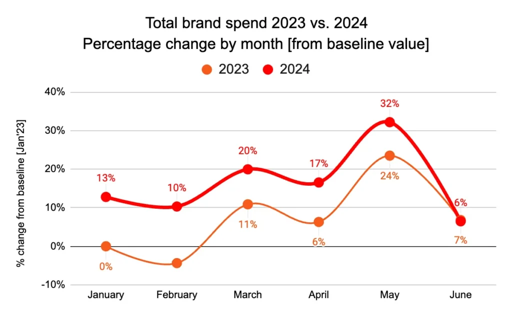 Brand spending rose by 9% so far in 2024. This was due to the higher transaction volume (7%), coupled with brands increasing commission rates by nearly 4% compared to the previous year.