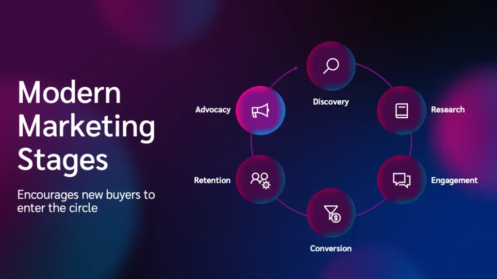Today’s marketing funnel looks more like a circle or a cyclical journey. The key stages have expanded to reveal: