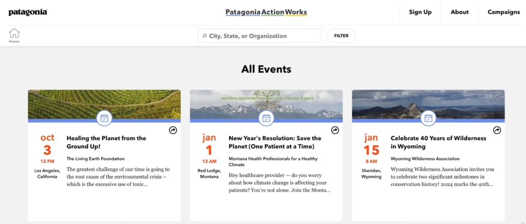 Patagonia hosts events online and in-person that align with their environmentalist mission, providing further value and highlighting their commitment to saving the planet.