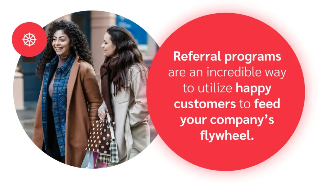 Set up a referral program encouraging existing customers to share their love for your brand with family and friends, feeding your company’s flywheel.