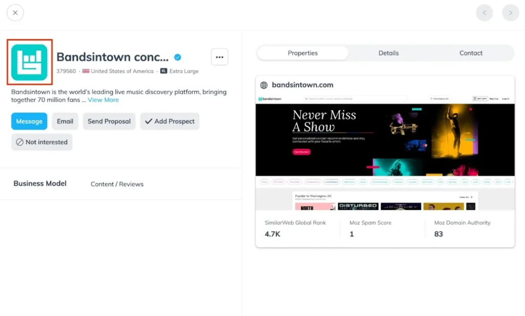 Bandsintown uploaded a clear, suitably sized logo that makes a great first impression on potential brand partners.