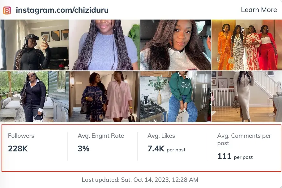 For creators, verified properties also pull in follower count and engagement rates. By showing these stats in her profile, creator Chizi Duru shows how she can help brands crush their marketing goals.