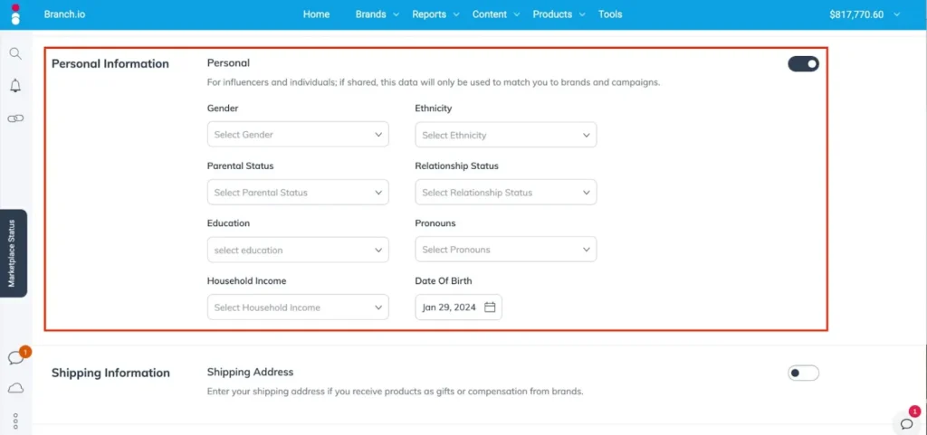 Click on the toggle and share details such as your gender, ethnicity, and more. Volunteering these facts helps connect you with brands looking for publishers and creators like you.