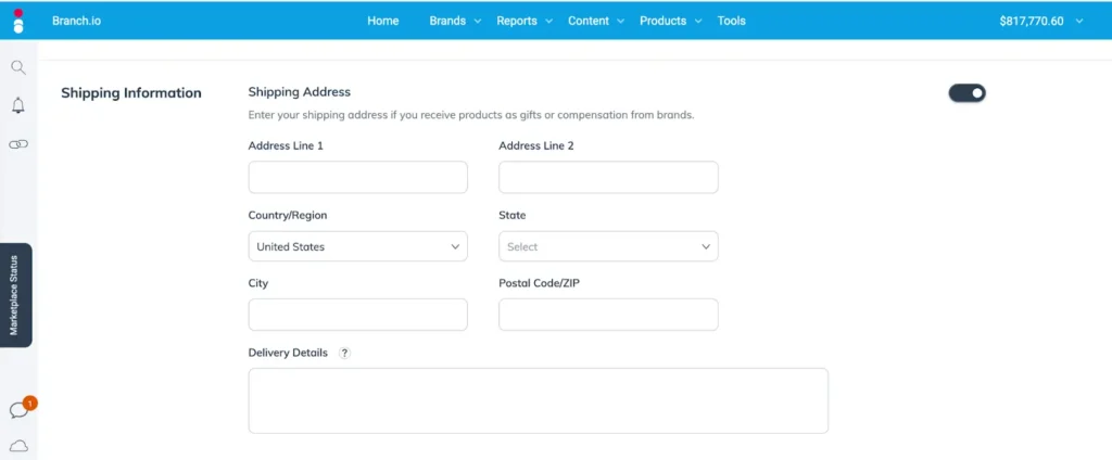 Next, go to Shipping Address. If you plan on receiving tester products or product gifts from brands, click the toggle to open the menu and enter where you’d like those products sent.
