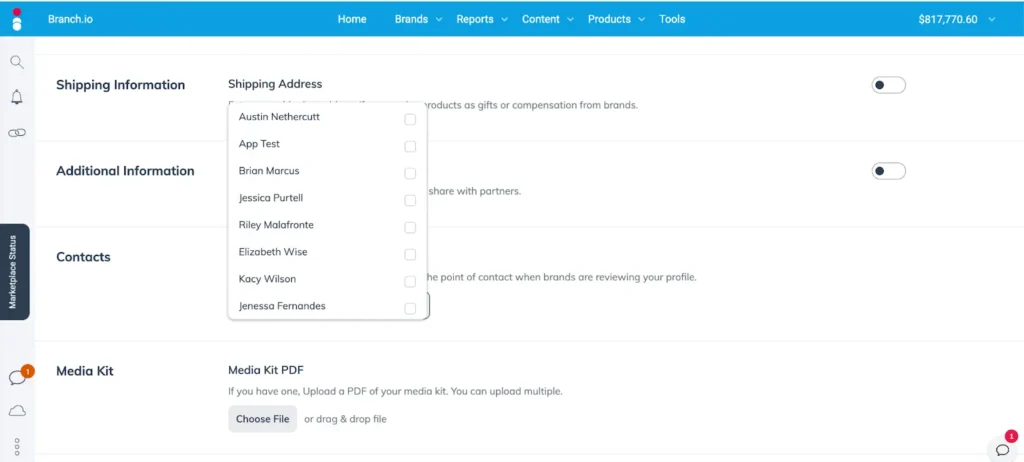 Select which contact will receive notifications of inbound opportunities from brands from the dropdown. Their contact information will also appear in the listing. You can pick more than one person if needed.