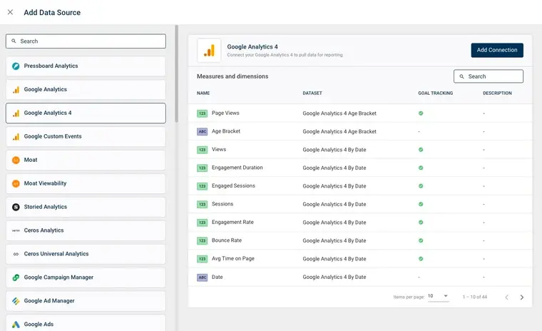 - On the right: A detailed view of your selected data source, such as the fields included and which fields can be used for Goal Tracking in your Pressboard campaigns.