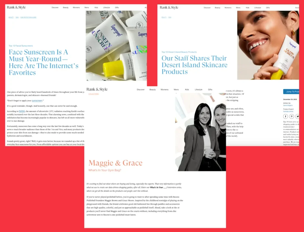 Rank & Style features affiliate links for the Supergoop! Glowscreen SPF 40 Sunscreen in multiple articles throughout its website, each taking different angles to engage the reader.