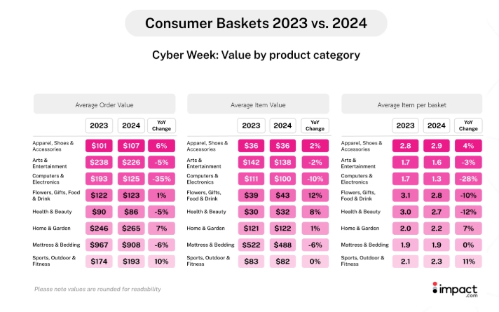 The Computers and Electronics category saw a significant increase in transactions (17%) compared to last year. However, average order value fell by 35% during Cyber Week.