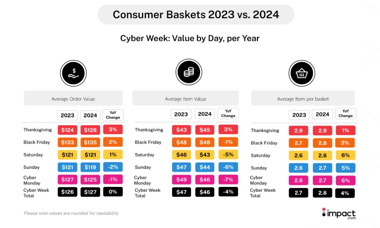 Shoppers purchased 4% more items per order than last year, leading to the average order value increasing 5% for the analysis period. During Cyber Week, AOV remained similar to last year.