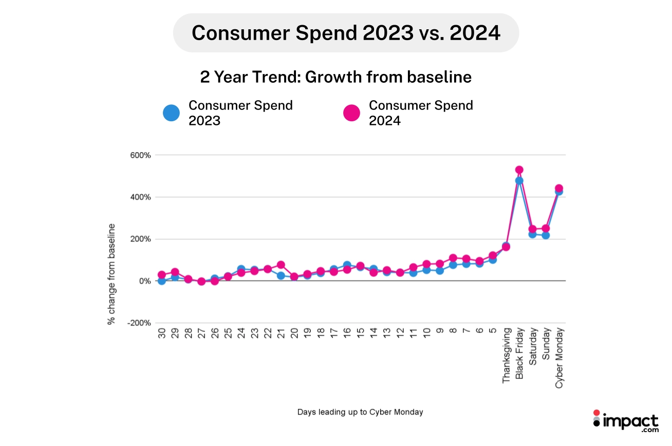 The discoverimpact.wpenginepowered.com team analyzed data from thousands of North American retail brands during the four weeks leading up to and including Cyber Week (November 2 – December 2, 2024). Our findings reveal how this more calculated approach to holiday shopping is reshaping partnership marketing strategies and creating new opportunities for brands to engage value-conscious consumers.