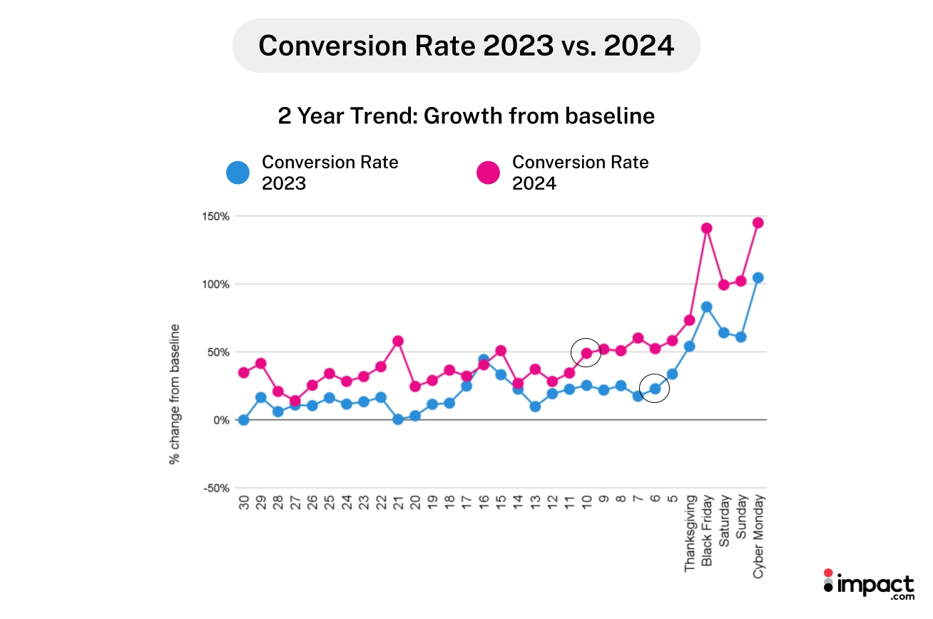 Conversion rates during the 2024 analysis period rose 19% compared to last year, gaining momentum on the Friday before Thanksgiving (day 10 on the chart). This was earlier than in 2023, when conversion rates started to pick up closer to Cyber Week.