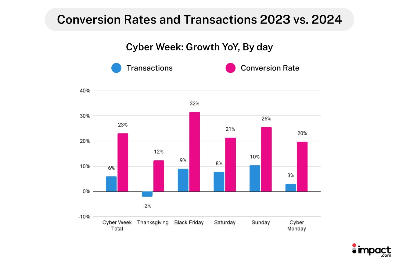 This year, conversion rates increased by 23% during Cyber Week compared to last year. This led to transactions rising 6% during Cyber Week YoY.