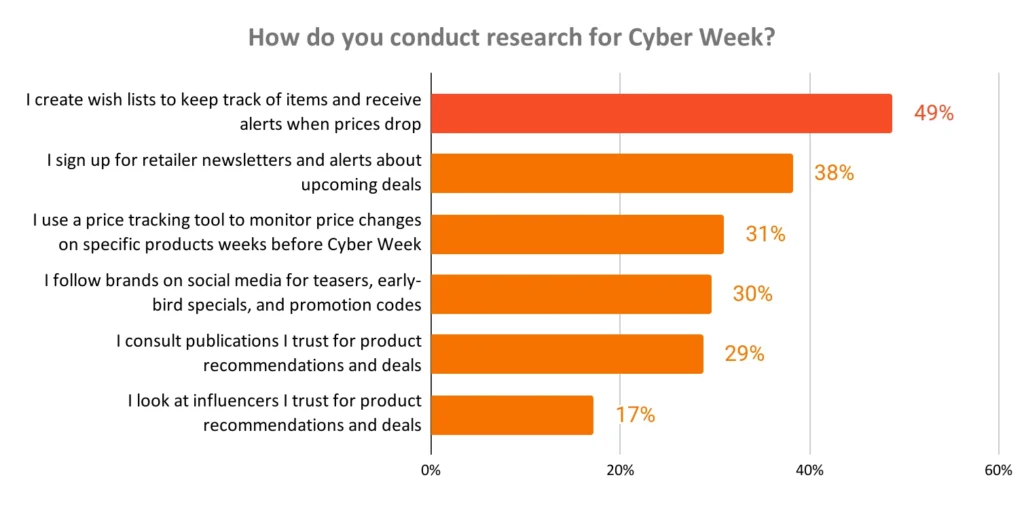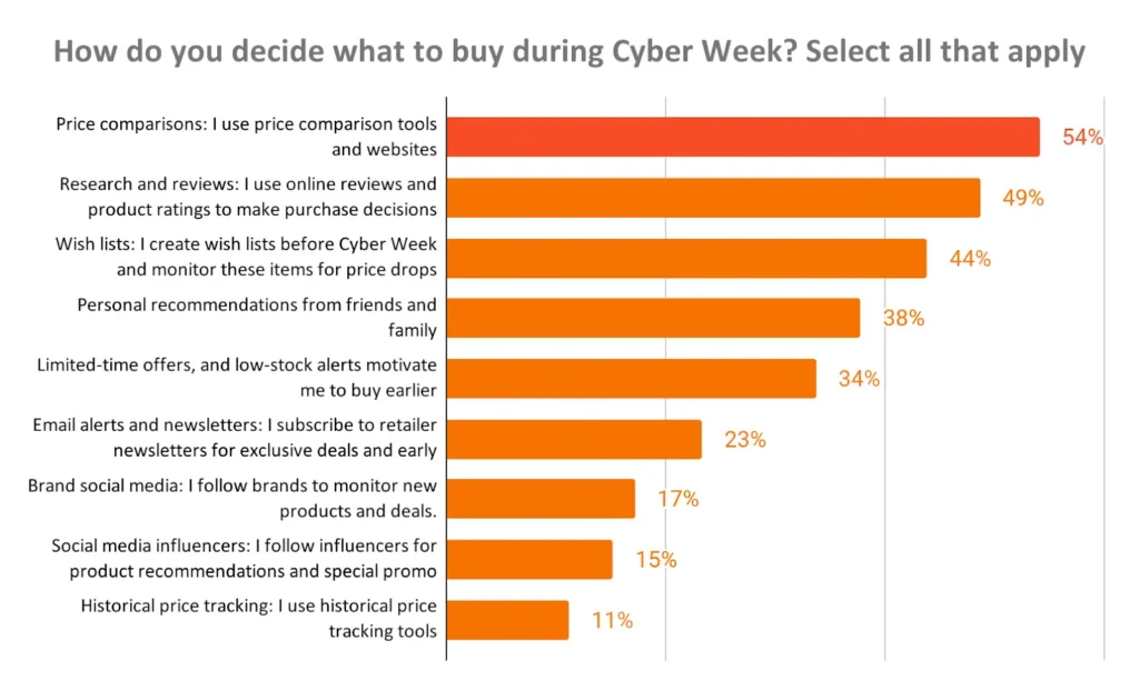 Though price comparisons stand out as the top way consumers decide what to buy during Cyber Week, research and reviews also play a crucial role, with 49% using them to guide purchases.