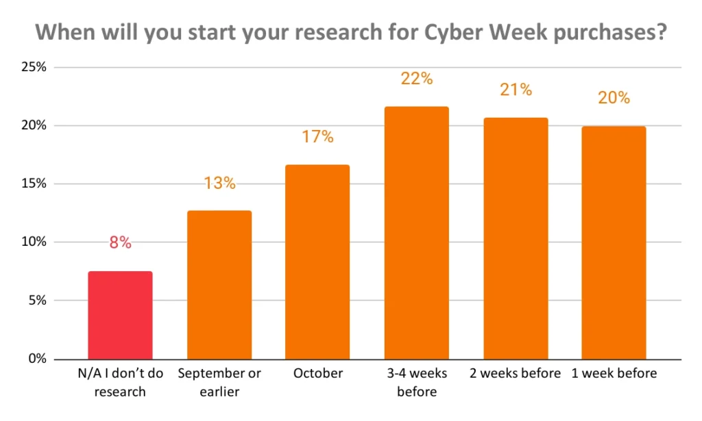 Just 8% of consumers shop spontaneously without researching during this period. While 30% begin researching before October, the majority (63%) begin exploring potential purchases one to four weeks before Cyber Week.