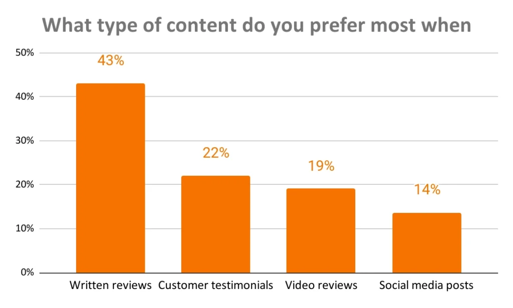 Among various content types favored by consumers for research, 43% prefer written reviews—despite the increasing popularity of video as a content medium for other purposes.