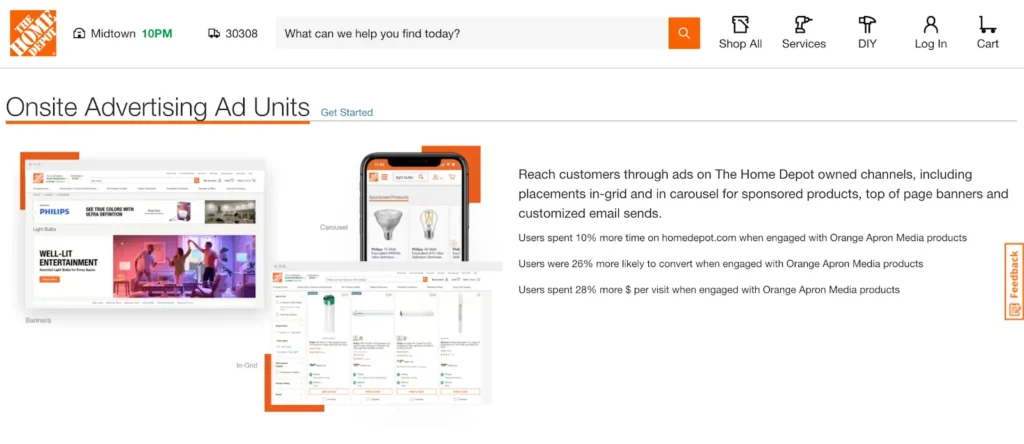 The Home Depot’s Orange Apron Media provides opportunities to reach consumers with ads embedded in various locations on their website, among other advertising services.