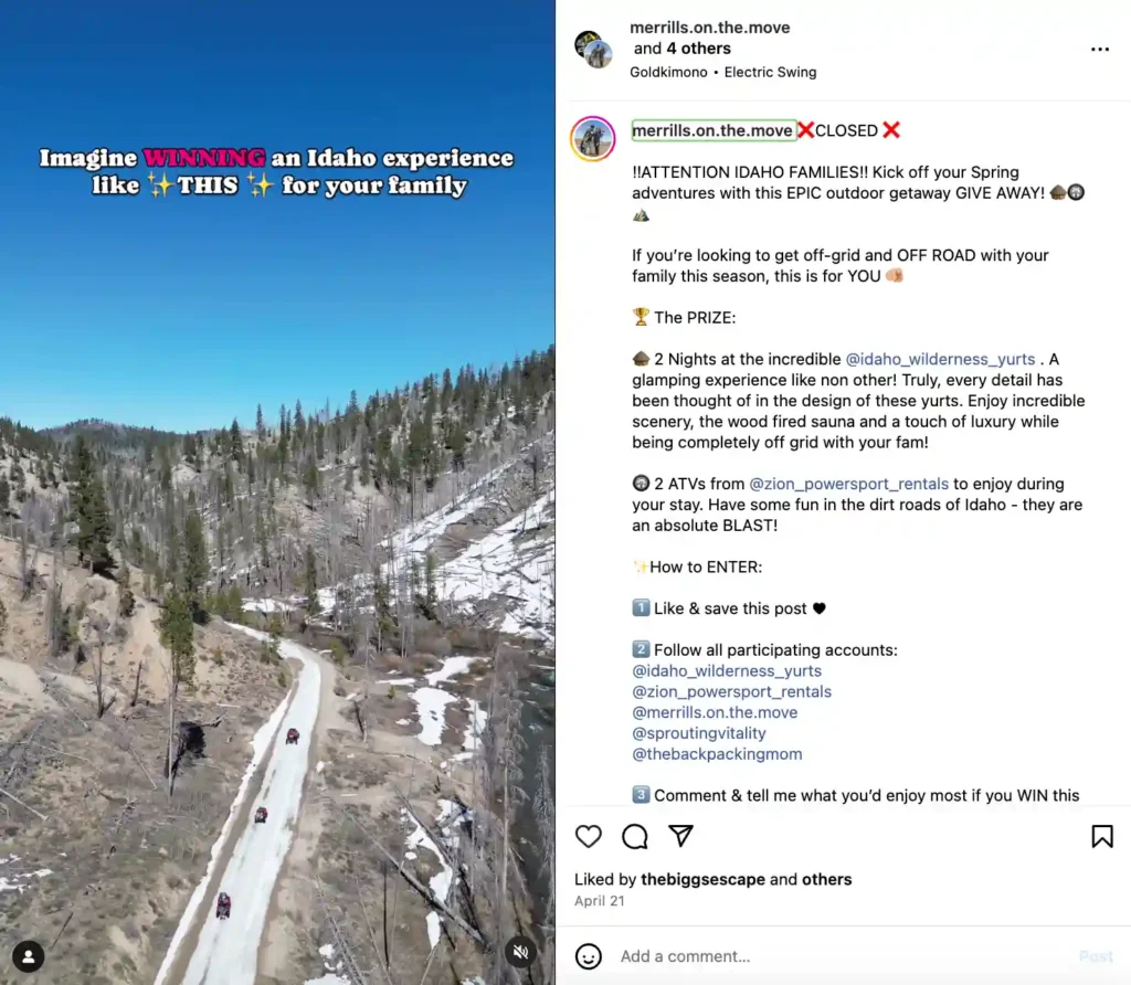 Ashley of @merrilsonthemove, an outdoor, travel, and family creator, made a big splash with followers when she offered up an epic offroading adventure in Idaho in collaboration with several brands, including Idaho Wilderness Yurts and Zion Powerspot Rentals.