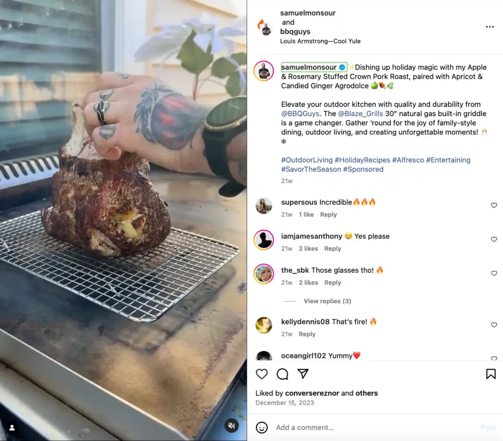 Sammy Monsour, a Michelin star chef and food influencer, created an autumnal recipe Reel featuring a Blaze Grill as part of his partnership with BBQGuys. Note: This brand deal may not have involved product gifting.