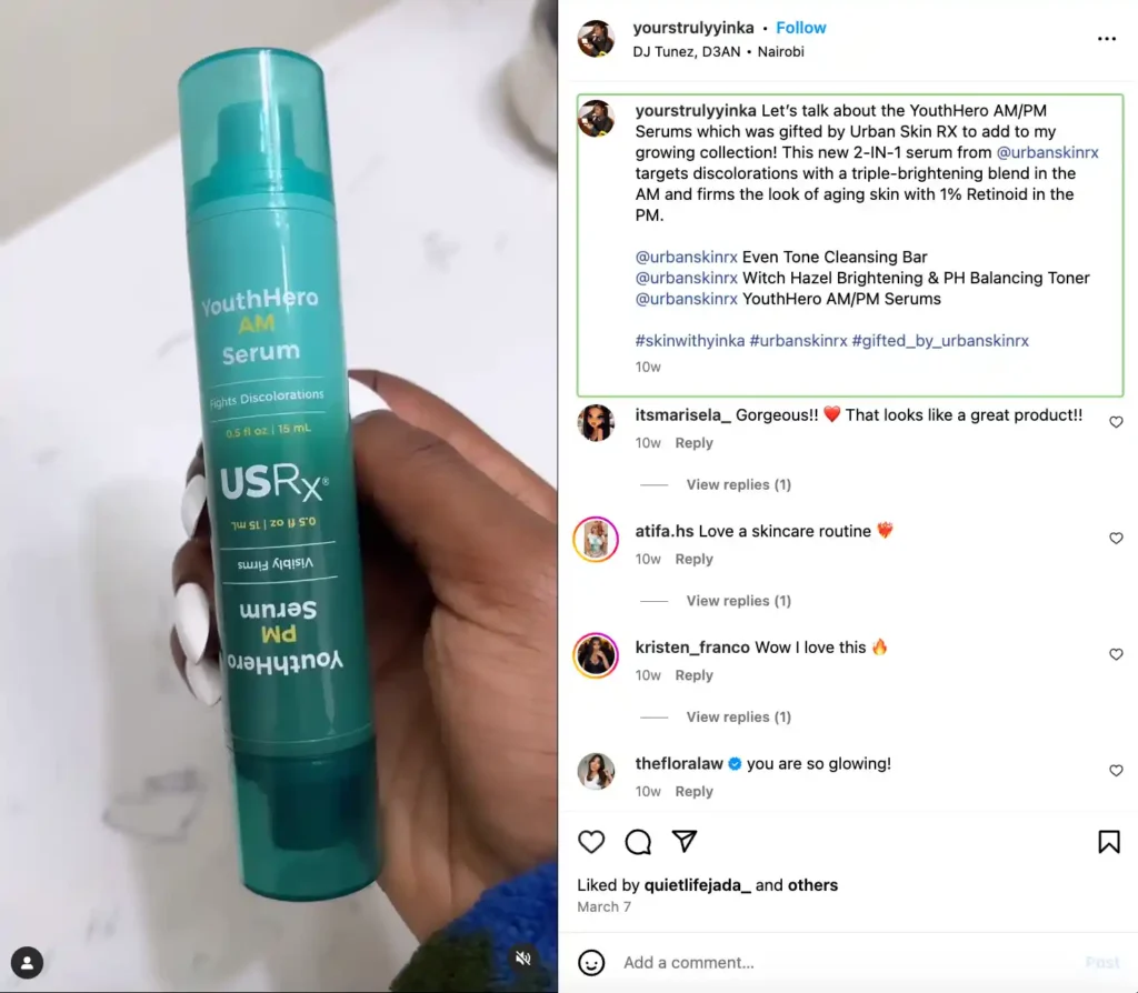 Yinka Oni-Orisan, a fashion and beauty creator, demos the Urban Skin RX YouthHero AM and PM serums in a relaxing skincare routine Reel. The video shows how beautifully the product applies and works with other products in her lineup.