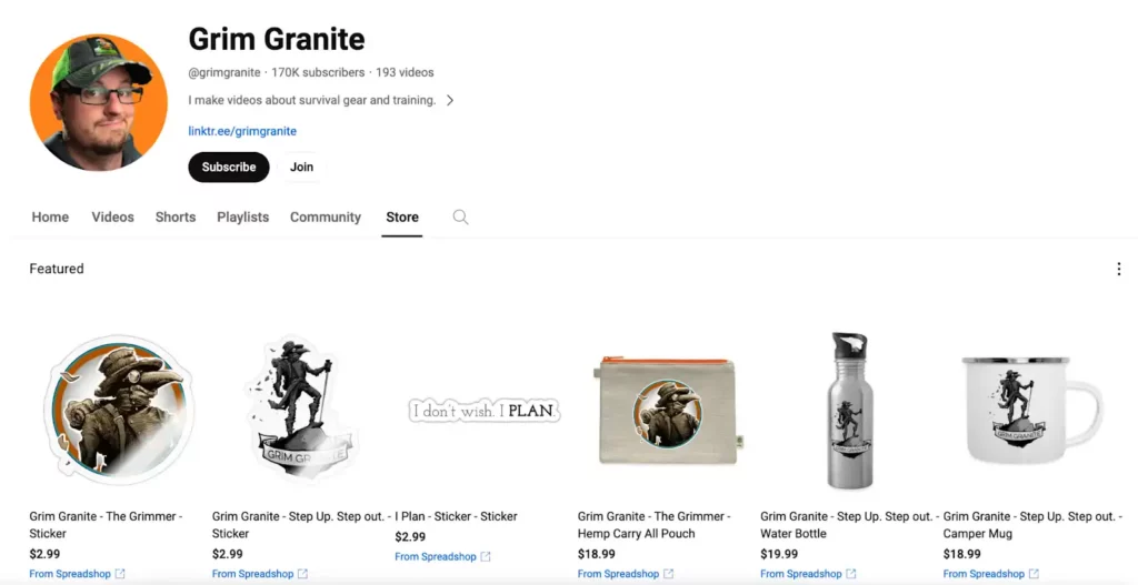 Outdoor and survivalist YouTuber Grim Granite sells merchandise to loyal followers through the platform.