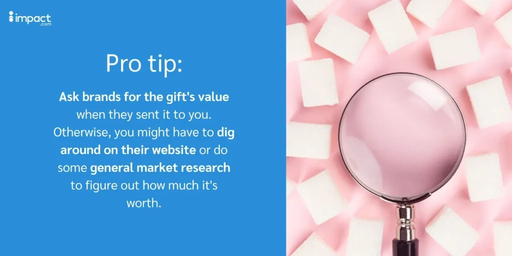 If the brand’s marketing team didn’t mention the gift’s value when they sent it, shoot them a message and ask. Otherwise, you might have to dig around on the website or do general market research to determine how much it’s worth.