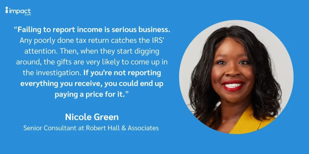 “Failing to report income is serious business. Any poorly done tax return catches the IRS’ attention. Then, when they start digging around, the gifts are very likely to come up in the investigation. If you’re not reporting everything you receive, you could end up paying a price for it.,” says Nicole.
