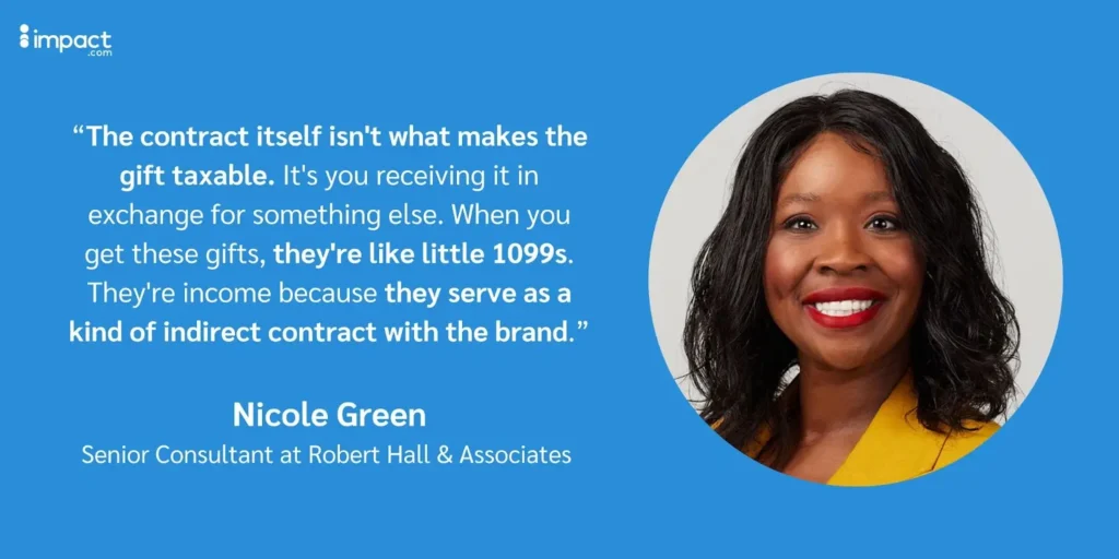 Nicole says, “The contract itself isn’t what makes the gift taxable. It’s you receiving it in exchange for something else. When you get these gifts, they’re like little 1099s. They’re income because they serve as a kind of indirect contract with the brand.”