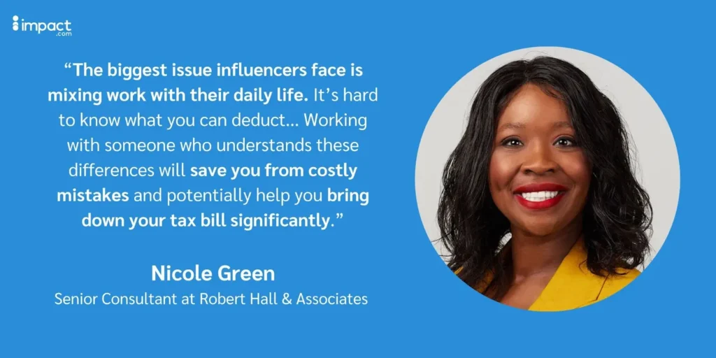 However, knowing which expenses you can write off takes time and effort. “The biggest issue influencers face is mixing work with their daily life. It’s hard to know what you can deduct. For example, haircuts won’t qualify most of the time—the only people who can deduct their haircuts are stylists. People in the army can’t even deduct their haircuts, and they’re mandatory,” explains Nicole.