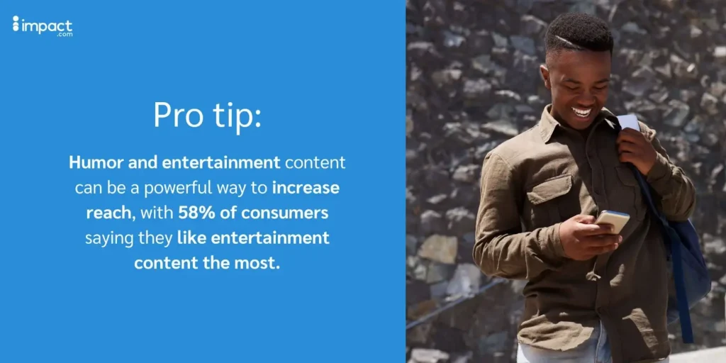 For example, if the brand aims to increase awareness, create content that maximizes reach. Humorous and entertaining content is great because it encourages social sharing, and research shows that 58 percent of consumers like entertainment content the most.