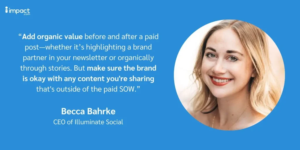 But, Becca Bahrke, CEO of talent management agency Illuminate Social, adds, “Make sure the brand is okay with any content you’re sharing that’s outside of the paid SOW.”