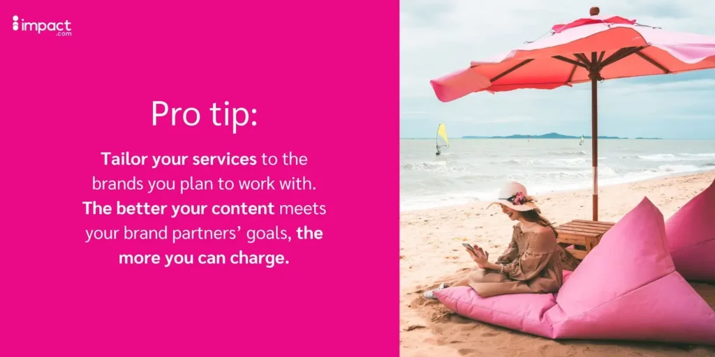 With your list of services in hand, start determining your rates. These prices aren’t just for brands—you can also use them as a baseline for yourself during negotiations.