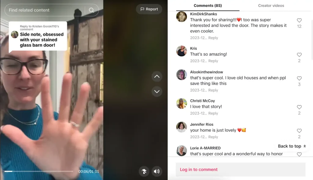 TikTok creator @babiesofsteele has two-way conversations with her followers in this post, where she tells the story of a unique barn door in her home in response to a follower’s comment.