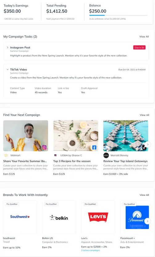 The newly redesigned Creator Dashboard offers a sleek and intuitive interface, making it easier than ever for creators to manage their workflow. Here, creators can effortlessly view pending tasks, and discover, and apply for new campaigns directly from the dashboard.