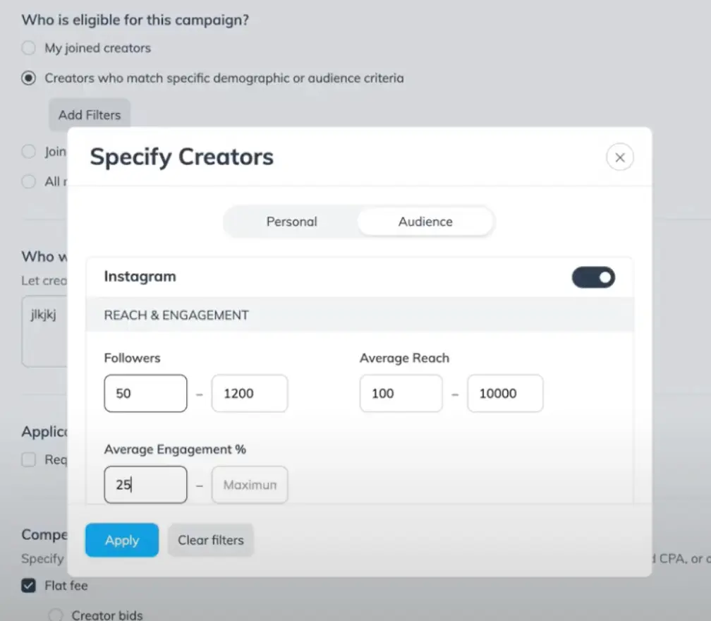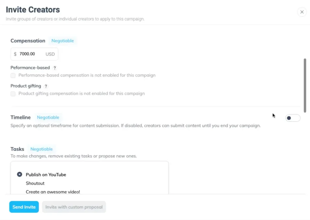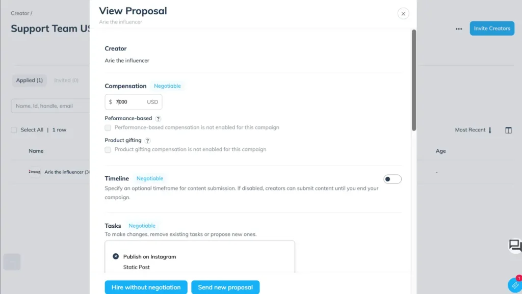 Assign unique tasks and compensation to various creators within the same campaign. Now you can adjust tasks and compensation for specific creators during the invite or hiring process.