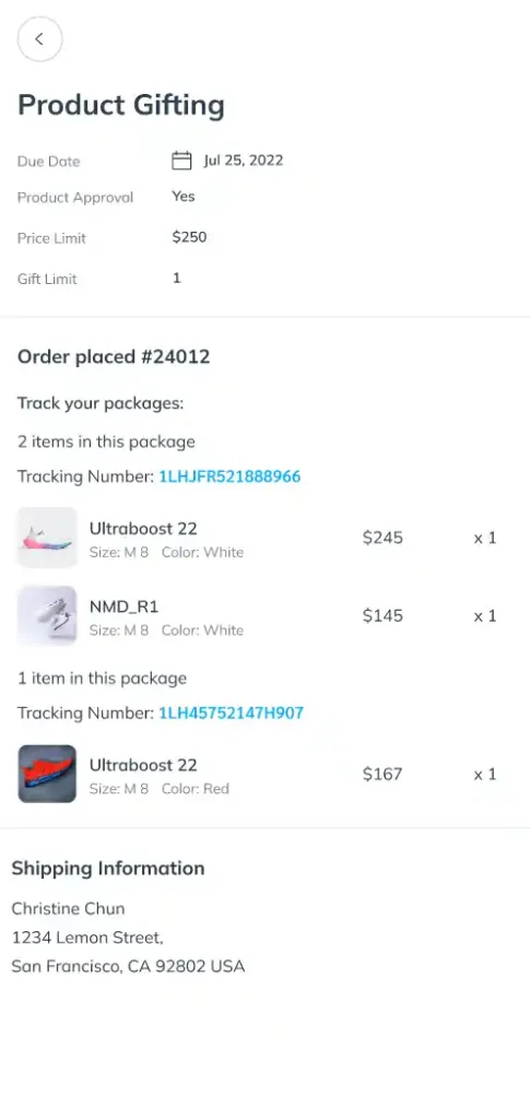 Sync your Shopify product catalog with campaigns, allowing creators to select eligible products and submit orders. This feature simplifies the product gifting process and enhances collaborations. Learn more about the Product Gifting feature here.