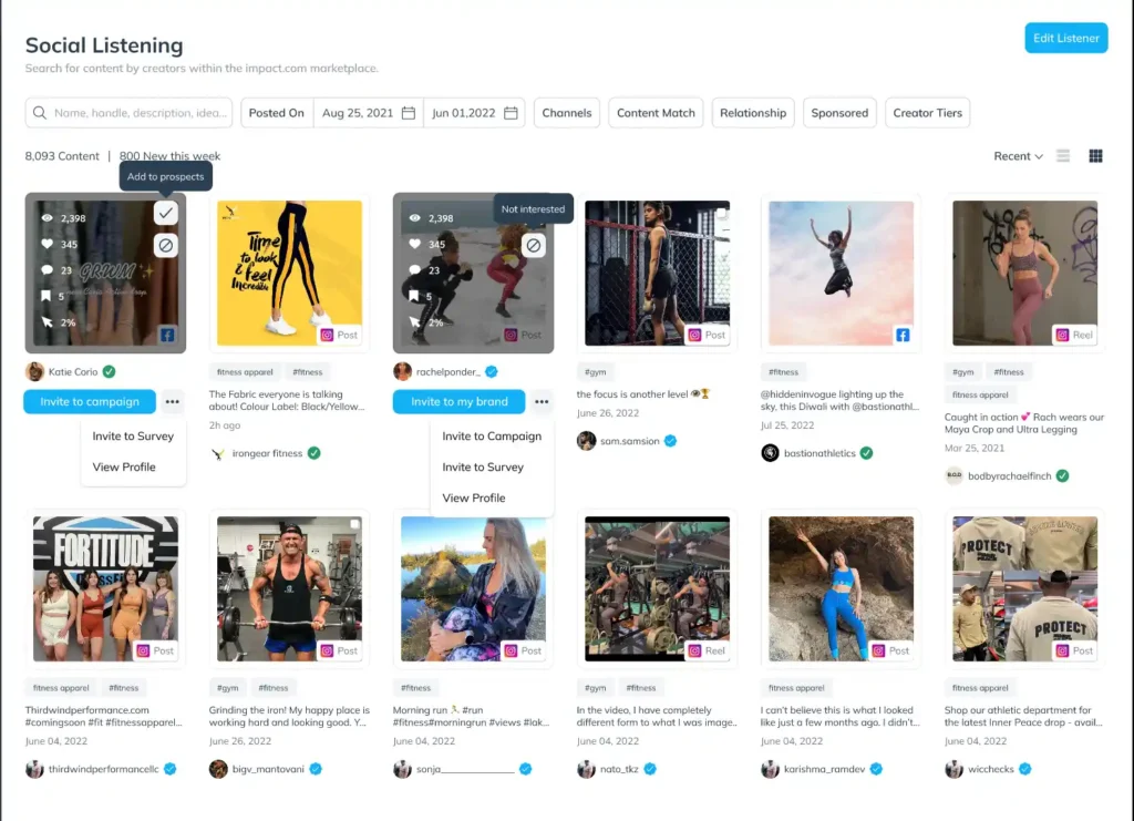 Discover influencers through their content with the upcoming Social Listening feature. This tool identifies creators discussing your brand on social media, helping you identify potential partners by their content and interactions. It’s a game-changer for finding influencers whose values and messaging align with your brand.