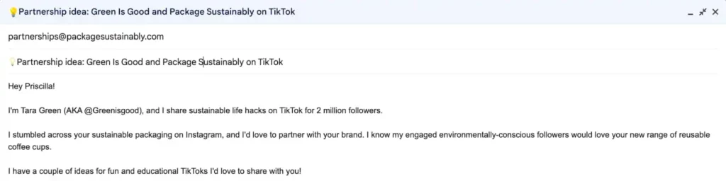 The email’s subject line summarizes the partnership idea. In the body, the creator introduces their niche and how the brand will resonate with their audience.