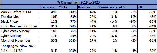 Impact’s data scientists took a look at key metrics during 2019 and 2020’s BF/CM shopping period to find out. They discovered that Impact’s retail and shopping clients saw their revenue grow from partnerships during 2020’s peak shopping season. Brands experienced revenue growth in the weeks leading up to Cyber Week, despite the upsets that the COVID-19 pandemic brought.
