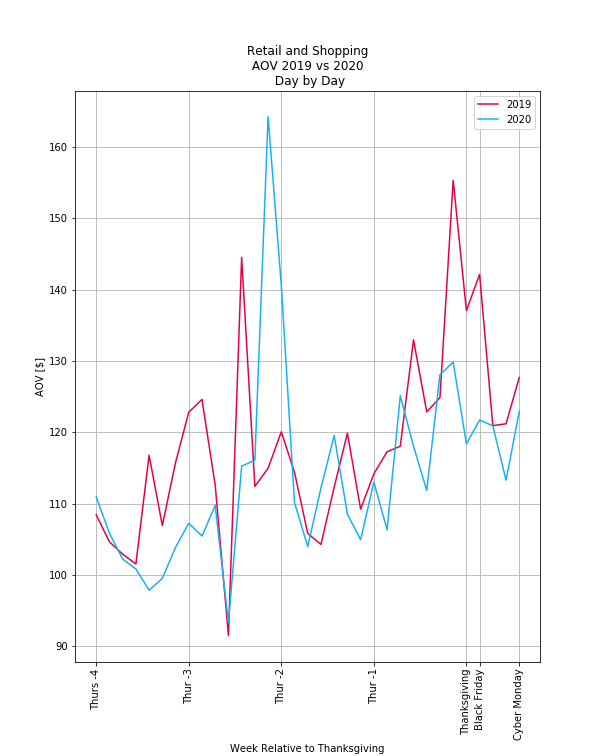 - AOV was down 14% and 4% on Black Friday and Cyber Monday respectively, compared to 2019.