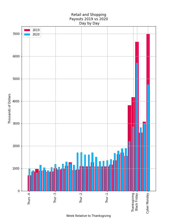 - Payouts were down 17% on Black Friday compared to 2019, while Cyber Monday payouts were comparably down 32%.