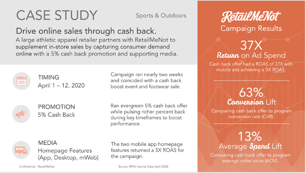 Cashback loyalty loops. We’ve seen a lot of retailers lean into cashback offers to create “loyalty loops,” i.e., rewarding customers for a purchase with cash that can be spent again at the retailer. Even retailers who had their own cash back programs in place are now offering cashback through RetailMeNot to help retain new customers and give them a reason to spend again and again.