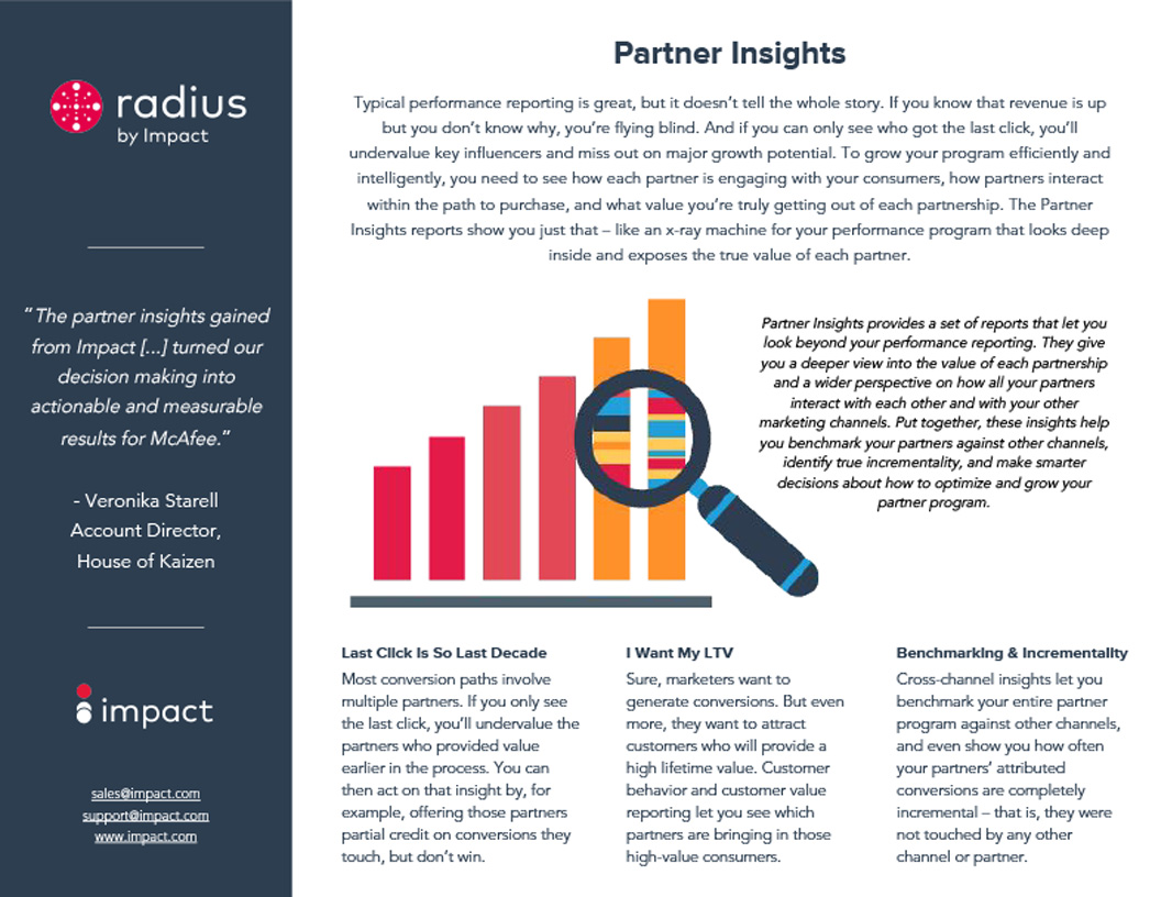 Impact’s Partner Insights provides you with a collection of insightful reports designed to give you a deeper look into the kinds of value your partners are really driving—and show you how those partners interact with each other and with your other marketing channels. Partner Insights’ Contribution Report offers you a unique opportunity to definitively know how often each of your partners acts as an introducer, closer, or influencer, and you don’t have to go on an epic journey to find out. What’s more, you can also discover how often each partner provides the only touchpoint in a conversion path (if they are a solo actor) and how often each partner was credited with the conversion (out of all the times it was involved in the conversion path).