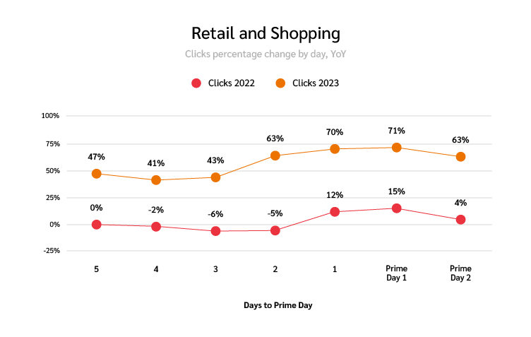 Clicks began to increase two days before Prime Day as consumers researched deals across retailers. Reported clicks were 52% higher than the previous year, with slightly more clicks occurring on the first day of the two-day event.
