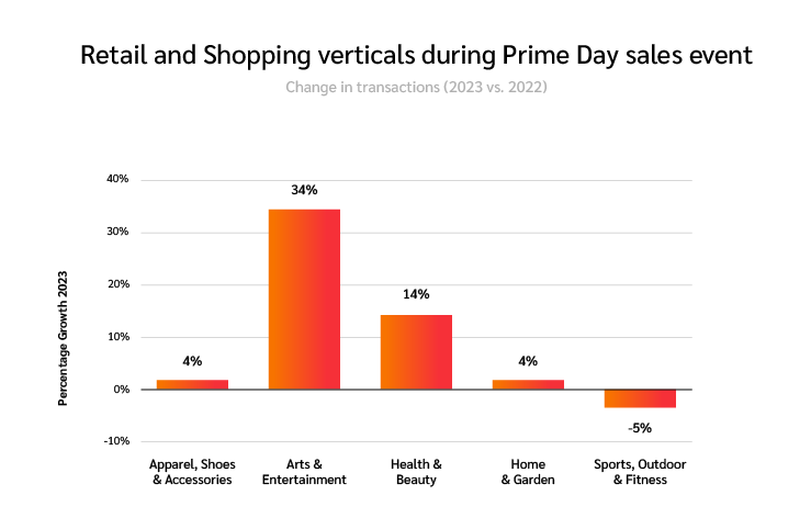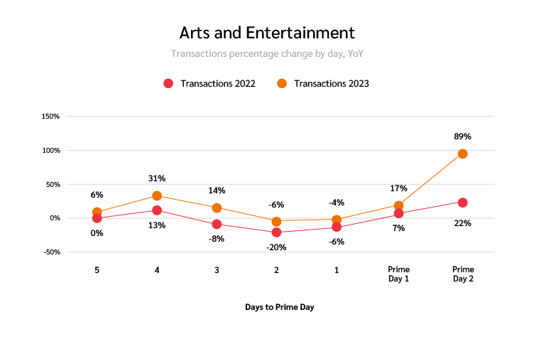 Furthermore, online stores within the other three categories experienced a boost in transactions on the second Prime Day. Arts and Entertainment brands saw a whopping 89% more transactions on the second day compared to the baseline value in 2022, signifying that these retailers may have capitalized on urgency by promoting more compelling deals on day two.