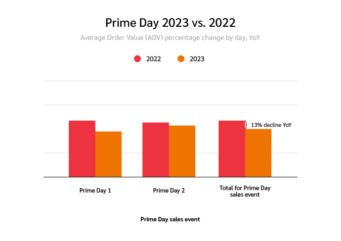 While there were significantly more transactions across retailers during 2023’s Prime Day event, AOV decreased by 13% compared to 2022. This decrease may be because more online stores offered Prime Day deals and discounts.