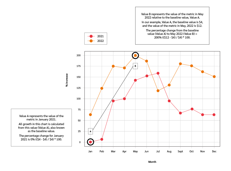 Unless otherwise noted, the values shown in each graph represent the percentage change in a metric’s value relative to that value at a specific time, also referred to as the baseline value. Our analysis measures all values relative to the baseline value—five days before Prime Day 2022.
