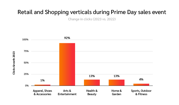 Most of these categories’ clicks only increased marginally from 2022 to 2023. However, Arts and Entertainment saw a massive 92% increase this year. This significant click increase corresponded with a 34% increase in transactions for those brands.